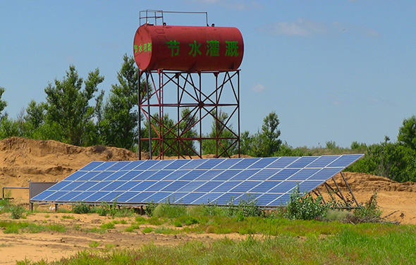 用Solartech 3kW光伏扬水沙漠生态光伏滴灌系统对沙漠经济植物进行全自动无动力滴灌,灌溉沙土面积105亩。