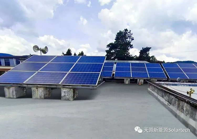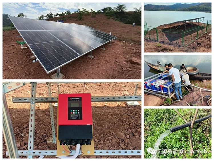 2022年8月在楚雄姚安的储备林光伏提灌项目建成运行,用于保障洋派水库临近山坡两千亩桃树的灌溉用水。该项目采用Solartech PB7500HG3-R扬水逆变器,配备光伏组件8.4kW,水泵配用功率5.5kW一台,扬程50米,流量6-8立方/小时。系统采用浮船取水方式,将水从洋派水库输送到高位蓄水池。配备远程监控系统,可实现对系统进行远程控制及数据读取等功能;同时具备市电、风电、柴油互补功能,满足业主24小时用水需求。系统采用清洁能源供电,每年可发电1万余度。全过程无碳排放,对环境友好,相比其他供电方式,每年可减排二氧化碳10吨。
