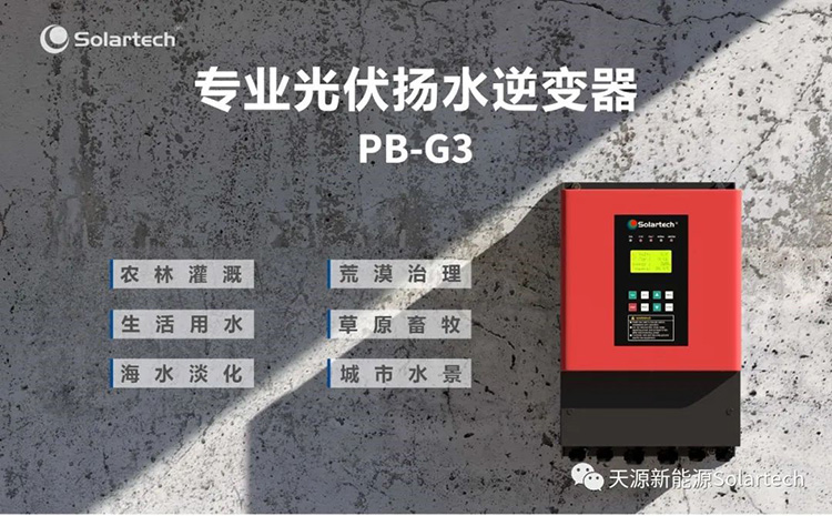 Solartech PB-G3光伏扬水逆变器,内置升压电路拓宽光伏输入电压范围,集成光伏优先、市电互补、远程监控、多泵并联、分期加密等功能,优化控制器和外置功能器件为一体,无需加装功能器件和外购控制柜体,可直接户外安装。在同样高品质的情况下,帮助用户减少运维支出。降低故障风险,节省投资成本。