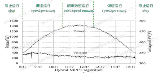 采用3044永利新能源光伏扬水逆变器,根据日照强度的变化调节水泵转速,使输出功率接近太阳电池阵列的最大功率;当日照很充足时,保证水泵的转速不超过额定转速;当日照不足时,根据设定最低运行频率是否满足,否则自动停止运行。